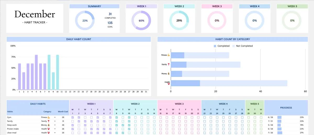 You will receive a downloadable Habit Tracker Sheet (Google Sheet link) designed to help you track daily habits, goals, routines, and progress.